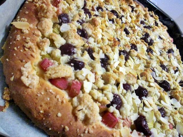 Mąkę wsypujemy do miski. Mleko podgrzewamy i wlewamy w dziurkę zrobioną w środku mąki. Dodajemy do środka drożdże i połowę cukru. Mieszamy nasz rozczyn delikatnie tak by po bokach mąka została sucha. wymieszany rozczyn posypujemy mąką i przykrywamy miskę ściereczką by wszystko wyrosło. Roztapiamy masło i dodajemy je do miski. Wsypujemy też resztę cukru i cukier wanilinowy, sól i jajka. Całość wyrabiamy aż ciasto będzie się odklejać od miski i rąk. Odstawiamy ciasto do wrośnięcia. Potem ponownie je zagniatamy i wykładamy na blaszkę. Nakłuwamy ciasto widelcem i rozkładamy na nim owoce. Użyliśmy 500g rabarbaru i słoik wiśni ale można było więcej. W oryginale jest 800 kg rabarbaru i 500g truskawek. Całość można posypać cukrem.