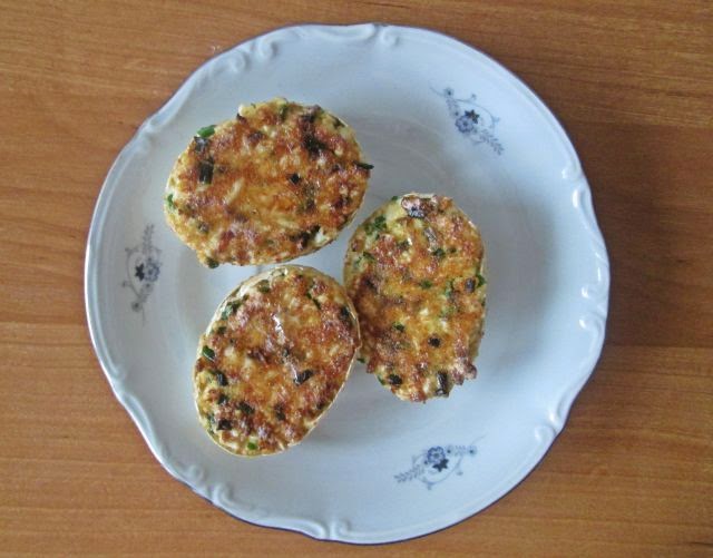 Rozgrzewamy posmarowaną olejem patelnię, a faszerowane skorupki odciskamy w bułce tartej (tą stronę gdzie wystaje farsz oczywiście). Potem tą stroną z bułką kładziemy je na rozgrzanej patelni i smażymy około minuty – nie za długo by bułka się nie spaliła, nie za krótko by się zdążył ugrzać farsz.