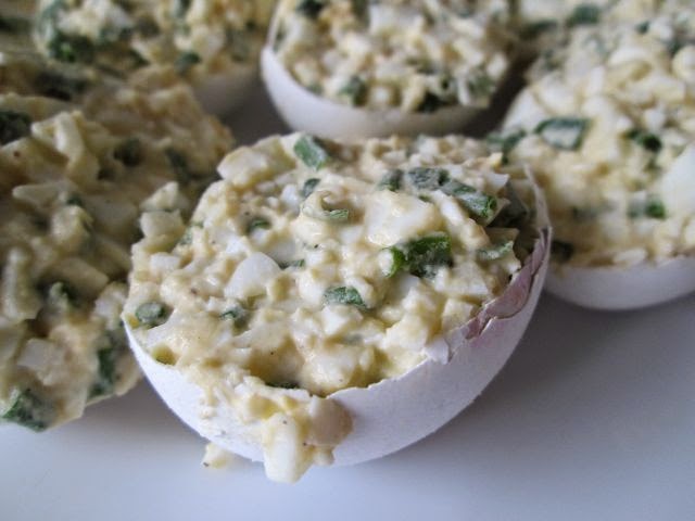 Jajka gotujemy na twardo. Po wystygnięciu zdecydowanym ruchem kroimy jajka (w skorupkach!) wzdłuż na dwie połowy. Skorupki zostawiamy! Łyżeczka wyciągamy jajko ze skorupek. Następnie jajka kroimy w drobniutką kosteczkę, kroimy też drobno umyty i wysuszony szczypiorek. Mieszamy jajka i szczypiorek ze śmietaną, doprawiamy solą i pieprzem, na tarce ścieramy ok. łyżkę masła. Całość dobrze mieszamy i napełniamy farszem skorupki jajek. Wstawiamy napełnione skorupki do lodówki.
