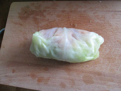 Zdecydowanie najgorszym fragmentem tego przepisu jest przygotowanie płatów kapusty, które musimy w pierwszej kolejności sparzyć. W tym celu gotujemy w dużym garnku wodę a gdy będzie już się gotowała, zanurzamy w niej główkę kapusty (wcześniej wykrawamy głąb – taki stożek). Liście będą miękły stopniowo, więc zaglądamy co chwilę do garnka i odcinamy kolejne zaparzone warstwy. Z jednej większej główki my otrzymaliśmy ok 16 odpowiednich liści do zawijania. Ścinamy też nadmiar głąba nożem, tak by wyrównać grubość liścia. Po zdjęciu liści nadających się go zawijania zostanie nam sporo kapusty – nie wyrzucamy jej! Zrobimy z niej coś pysznego! Co? To już opiszemy w kolejnym przepisie 🙂