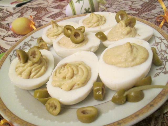 Kroimy kilka oliwek w plasterki i układamy na talerzu razem z faszerowanym jajkami (to dla tych, którzy lubią więcej oliwek) 🙂