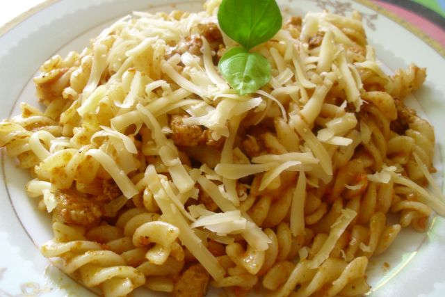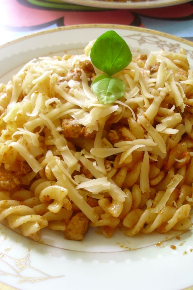 Makaron gotujemy. Cebulę i czosnek siekamy dość drobno. Mięso myjemy i kroimy w kosteczkę. Na patelni rozgrzewamy olej i wrzucamy czosnek, cebule i kurczaka. Doprawiamy solą i pieprzem. My bardzo lubimy użyć przyprawy do kurczaka np. kebab-gyros. Czekamy, aż kurczak będzie gotowy. Następnie wrzucamy makaron na patelnie. Gdy całość jest ciepła wyłączamy ogień pod patelnią i dodajemy pesto. Mieszamy całość. Potem nasze danie zrzucamy na talerz i posypujemy żółtym serem choć pewnie  parmigiano reggiano pasowałby idealnie i jak ktoś go lubi to polecamy go użyć.
