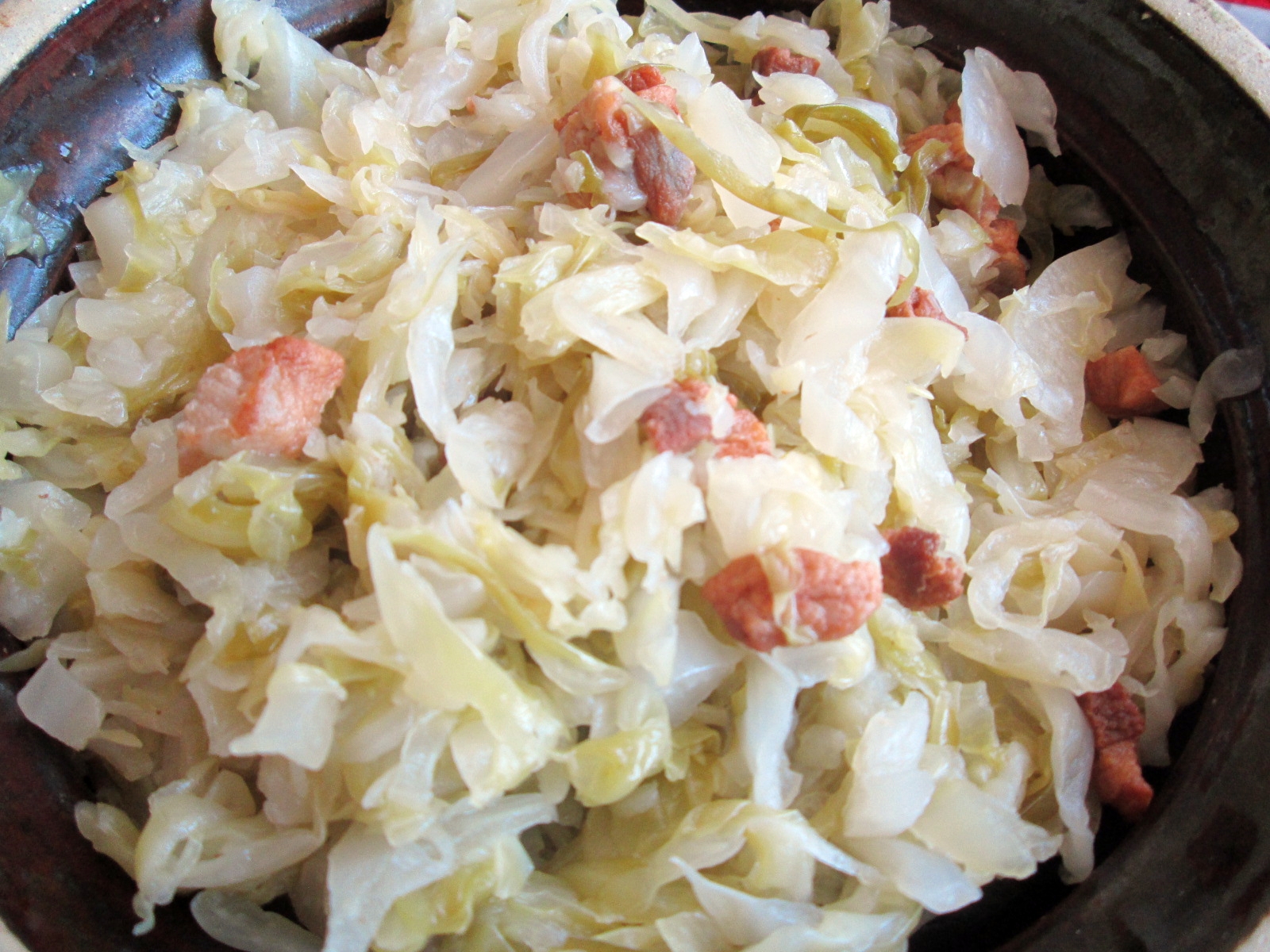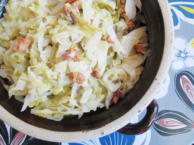 Boczek kroimy w drobną kostkę i wysmażamy na skwarki. Kapustę drobno szatkujemy. Przekładamy kapustę do dużego garnka i wlewamy wodę – 2-3 szklanki. Gotujemy pod przykryciem do miękkości. Dodajemy skwarki z odrobiną wytopionego tłuszczu. Doprawiamy solą, cukrem i kwaskiem. Podajemy jako dodatek do młodych ziemniaków