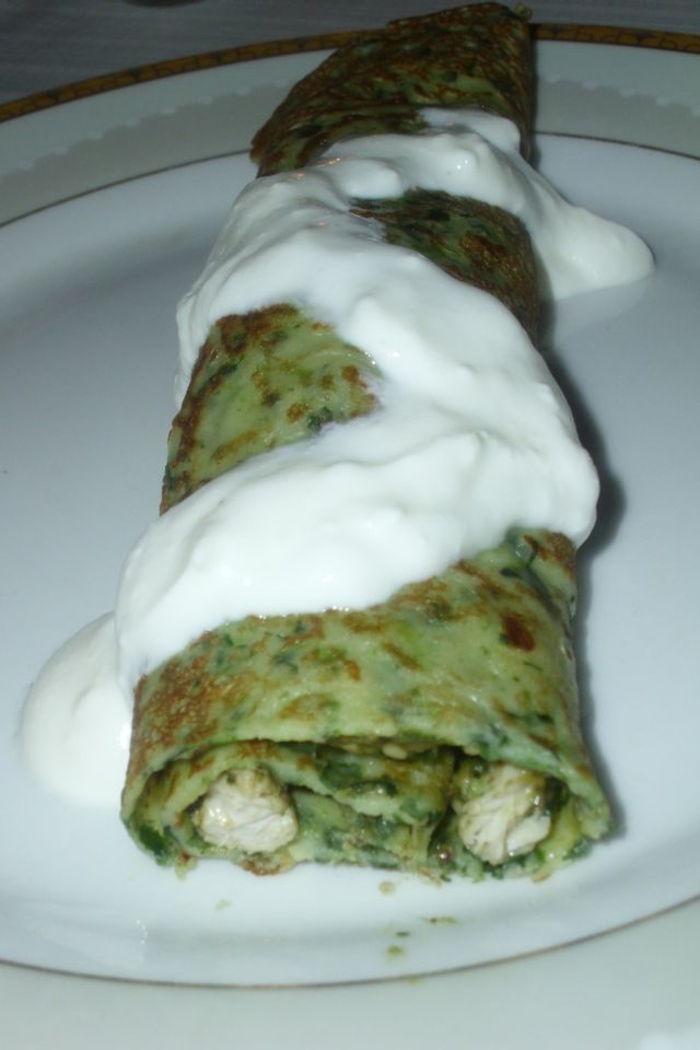 Na talerzu układamy naleśnika. Układamy na niego przygotowany farsz i zawijamy w rulonik. Całość polewamy sosem czosnkowym przygotowanym z jogurtu, 2 ząbków czosnku i soli. Oczywiście naleśniki jemy na ciepło. Smacznego!