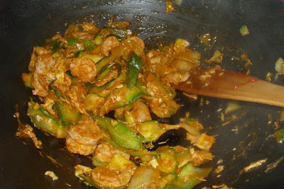 Cebule kroimy w kostkę lub w piórka – dowolnie. Wrzucamy na rozgrzany olej na patelni lub w woku. Gdy się przesmaży dodajemy pokrojoną cukinię.