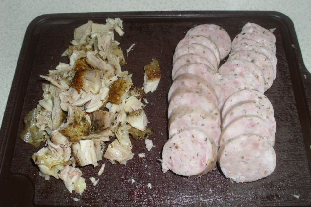 opcjonalnie – białą kiełbasę, śląską, kabanosa, kurczaka – w zależności od zasobności lodówki 🙂 my użyliśmy tu białą kiełbasę i grillowane udko kurczaka, obrane i pokrojone w kosteczki.