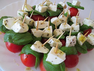 Pomidorki koktajlowe z mozzarellą i bazylią na wykałaczkach sprawdzą się doskonale jako przekąska przy winku itp. Na 4-5 osób wystarczy jedno opakowanie pomidorków, jedno opakowanie mozzarelli mini w kulkach lub jedna duża kulka, kilkanaście listków bazylii. Kiedy robimy takie pomidorki mozzarellę odsączamy z zalewy, kroimy, jeżeli korzystamy z dużej kulki, w wygodne kawałki i chwilę marynujemy z oliwie z dodatkiem suszonej bazylii, odrobiny soli i pieprzu. Trudno jest skropić takie koreczki oliwą kiedy już stoją na talerzu.