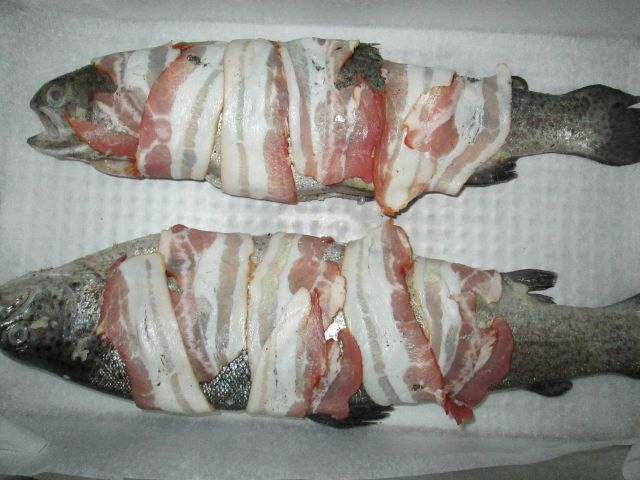 Święta już dawno za nami, styczeń już się kończy. Wigilijne przysmaki pobudziły nasze kubki smakowe. Nie może być tak, że rybę jada się tylko w Wigilię. Dlatego kontynuujemy zeszłoroczne postanowienie by jak najczęściej jadać ryby! Dziś pyszny przepis na pstrąga w bekonie. Dysponujemy tylko zdjęciem przed… Domyślicie się zapewne dlaczego :):):) Kto by czekał na zrobienie zdjęcia kiedy na talerzu rybka i boczuś!