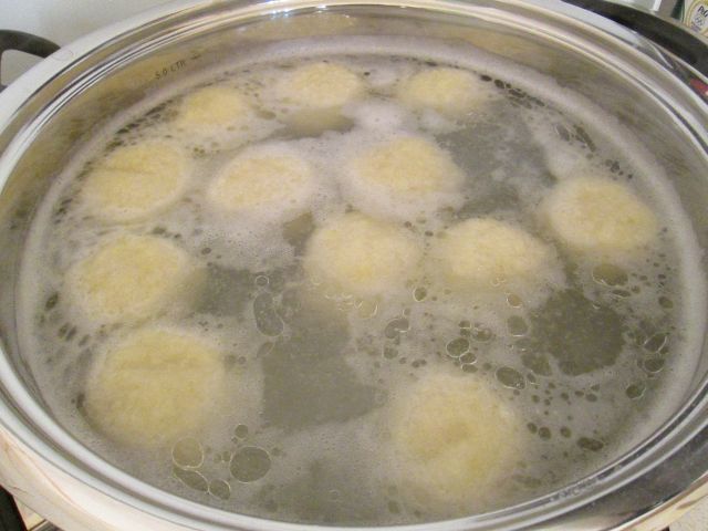 Pozostałe ziemniaki ścieramy na tarce o drobnych otworach. My po starciu zmieliliśmy wszystko jeszcze w blenderze. Następnie odciskamy przez ściereczkę masę ziemniaczaną do miseczki. Sok pozostawiamy na 15 minut, aby na dnie osadziła się skrobia. Mieszamy ziemniaki surowe i gotowane. Po odstaniu się soku zlewamy sok a skrobię dodajemy do masy ziemniaczanej. Następnie formujemy nieduże kule i kładziemy delikatnie na wrzącą, osoloną wodę. Raz po raz mieszamy pyzy aby się nie posklejały. Gotujemy je ok. 10 minut od chwili wypłynięcia na wierzch.