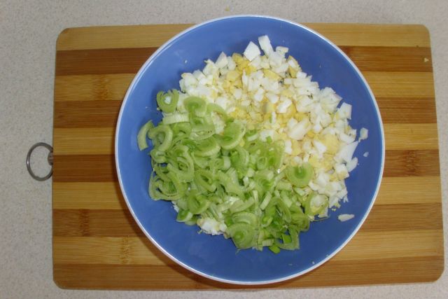 Jajka kroimy w drobne kosteczki. Pora kroimy wzdłuż a później w poprzek, w wąskie piórka. Mieszamy i doprawiamy solą i pieprzem. Dodajemy jogurt. Po wymieszaniu możemy przejść do jedzenia 🙂