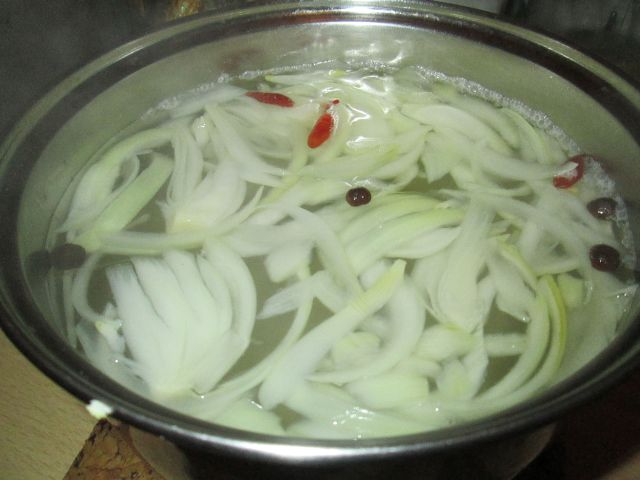 Cebulę pokroić w piórka. Pozostałe składniki zagotować w garnku. Kiedy się zagotują dołożyć do nich pokrojoną cebulę i gotować przez chwilkę.