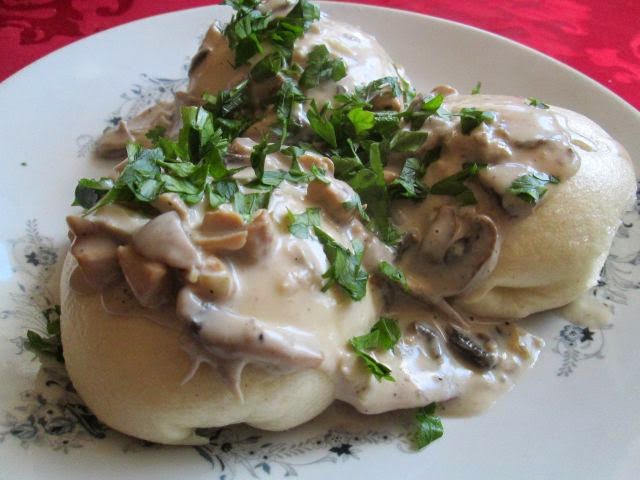 Cebulę kroimy w drobną kostkę i podsmażamy na patelni i przekładamy do garnka. Na czystej patelni smażymy pierś kurczaka również pokrojoną w drobną kostkę, doprawiamy je solą i pieprzem, przekładamy do garnka z cebulą. Pieczarki oczyszczamy, kroimy w półplasterki, smażymy i dodajemy do garnka z cebulą i kurczakiem. Całość chwilę podsmażamy, dolewamy śmietanę, doprawiamy solą i pieprzem. Do sosu możemy dodać siekaną natkę pietruszki (lub dodać suszoną), albo posypać świeżą natką danie na talerzu.