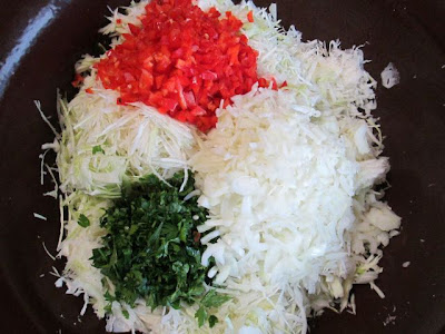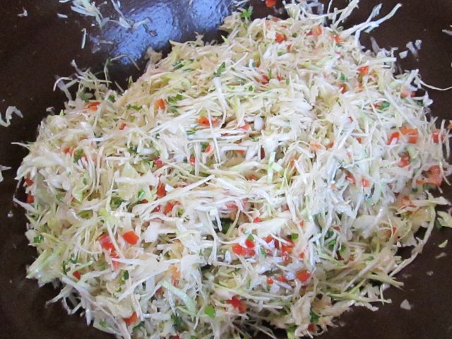 Kapustę drobno poszatkować. Paprykę pokroić w kosteczkę, podobnie cebulę. Pietruszkę posiekać. Wymieszać składniki razem.