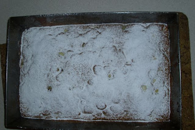 Blachę na placek możemy natrzeć margaryną lub położyć na dnie papier do pieczenia. Pieczemy w piekarniku nastawionym na 180 stopni przez 45 minut. W naszym piekarniku gazowym pieczemy 30 minut na poziomie 6. Po wyjęciu placka z piekarnika posypujemy cukrem pudrem.