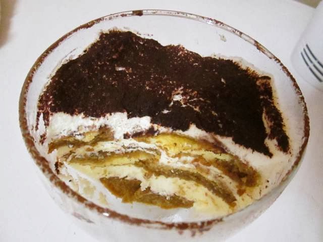 Wykładamy część masy na biszkopt w zależności od tego ile chcemy zrobić warstw. My wykładamy połowę masy na biszkopt, na to wykładamy nasączone biszkopty (każdy biszkopt wkładamy do ostudzonego naparu kawowo-alkoholowego na kilka sekund, dopóki poczujemy, że robi się już miękki). Na warstwę biszkoptów wykładamy pozostała masę. Całość obsypujemy obficie kakao (przez sitko). Schładzamy w lodówce (minimum 2-3 godziny).